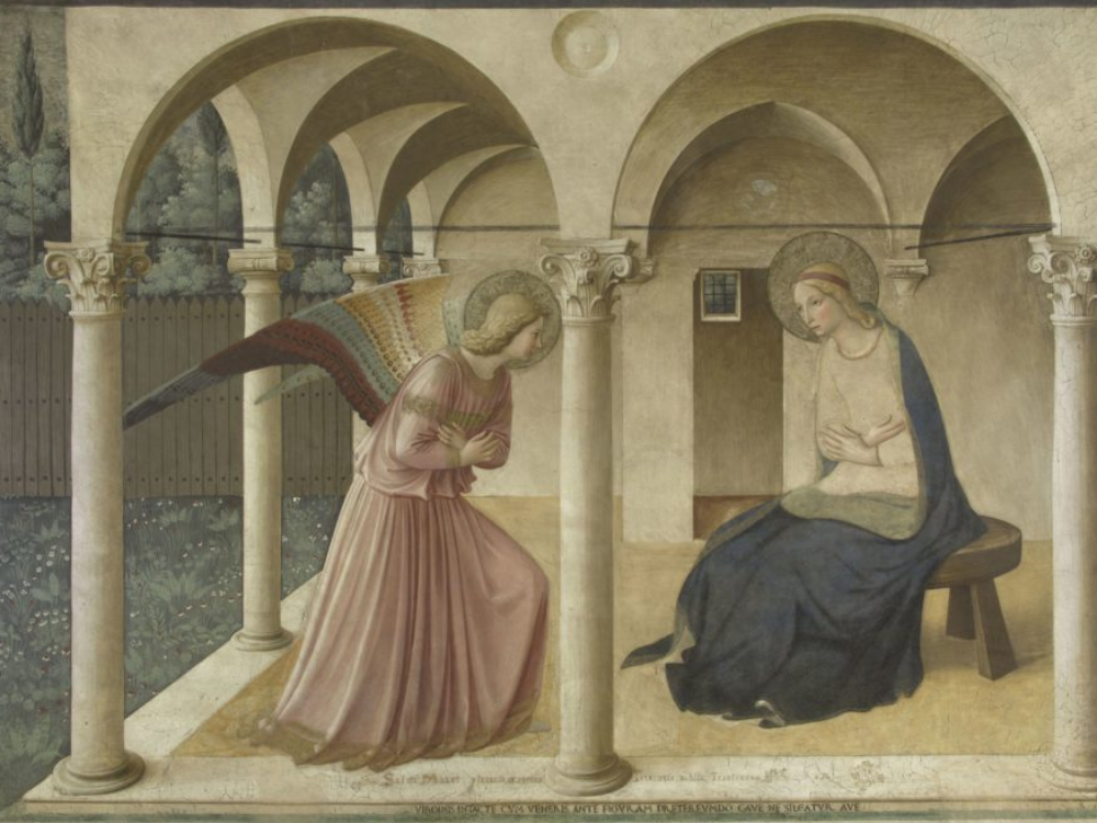 De Annunciatie van Fra Angelico, Maria en de engel, een fresco in het klooster van San Marco in Florence.